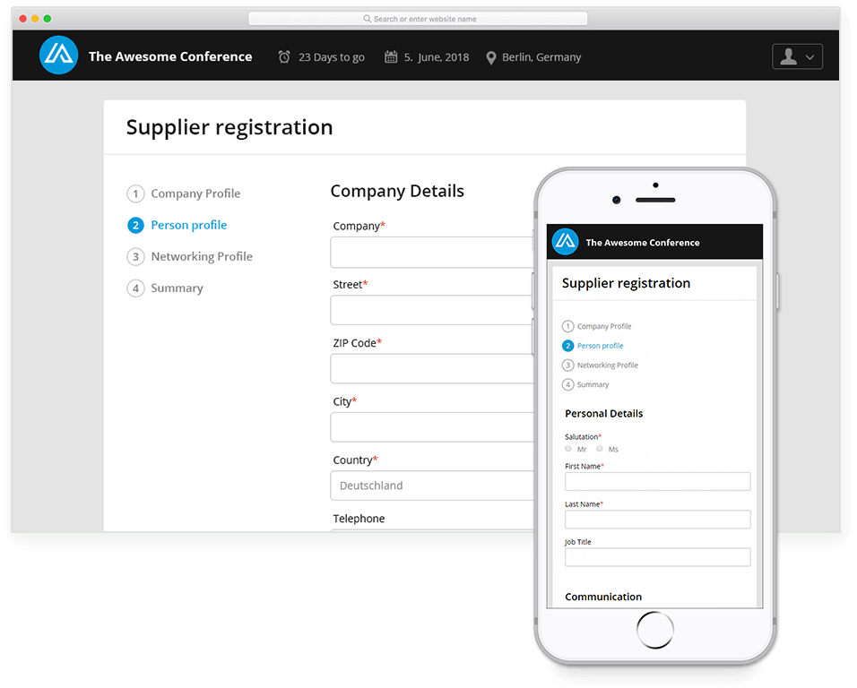 Die Registrierung für Sie als Fachbesucher ist unkompliziert und erfolgt in drei Schritten: Berufliche E-Mailadresse eingeben, E-Mail mit Verifizierungslink bestätigen und Registrierung vervollständigen. Anschließend können Sie in Ihrem Profil weitere Daten erfassen und individuelle Kontaktvorschläge erhalten.