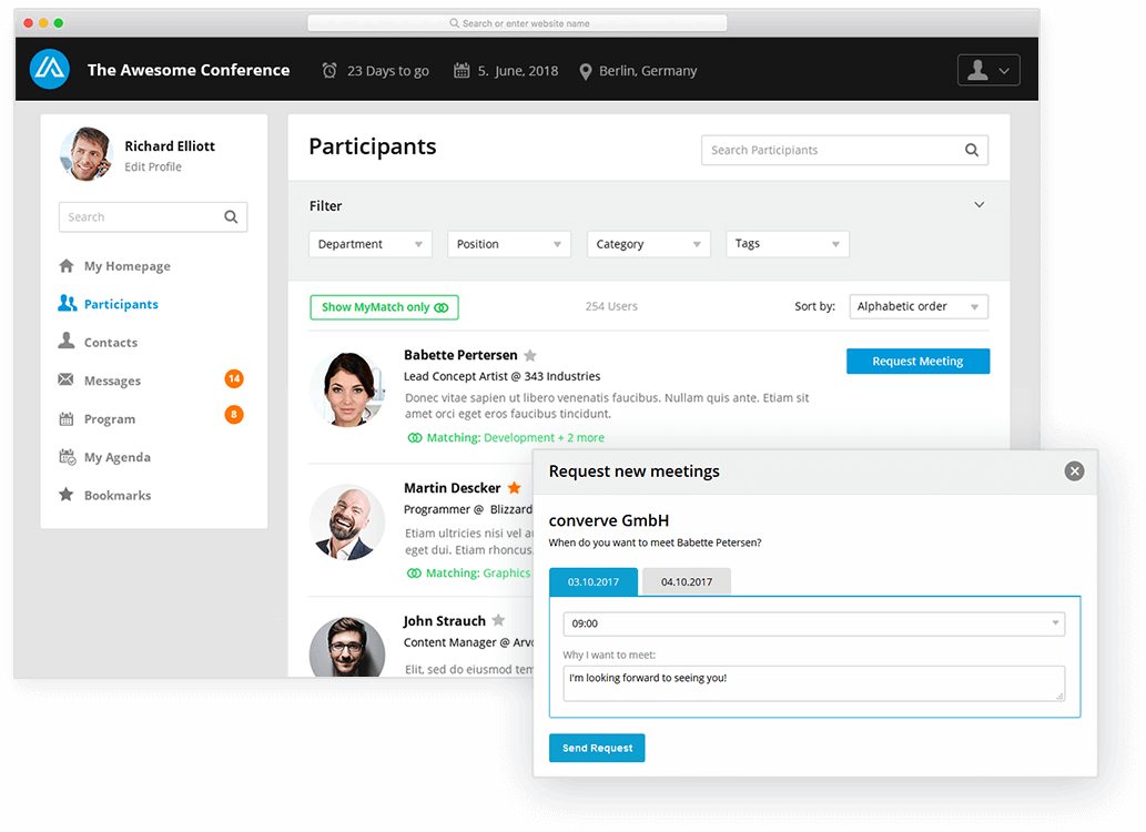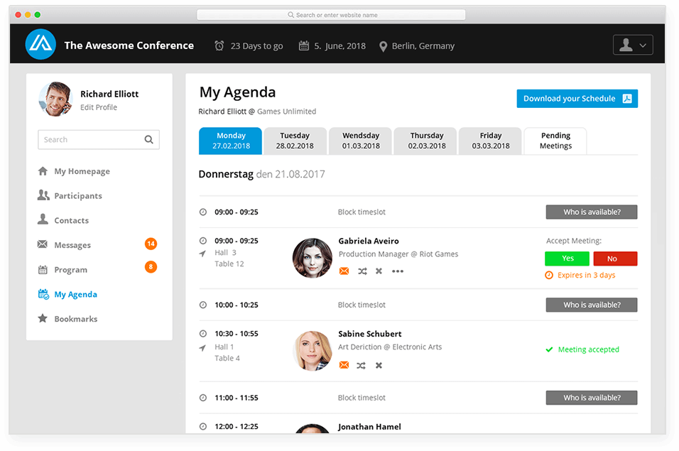 Versenden und empfangen Sie ebenfalls Nachrichten, blocken Sie Timeslots und bauen Sie Ihre Favoritenliste auf. Wir bieten Ihnen alle Tools, um Ihr geschäftliches Netzwerk während dieser Veranstaltung nachhaltig zu erweitern.
